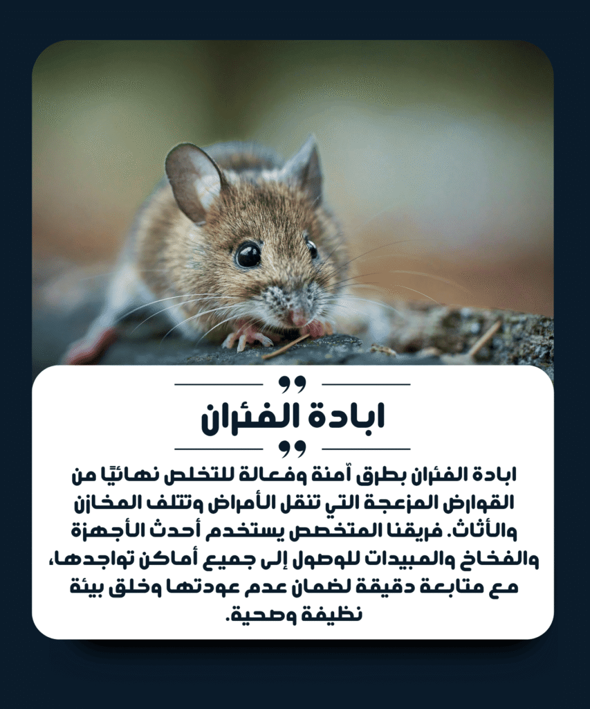 وفي مجال مكافحة القوارض، نتميز بخدمة فعالة لإبادة الفئران والجرذان باستخدام تقنيات حديثة ومعدات متطورة، مع تركيب مصائد احترافية وسد جميع الفتحات ونقاط الدخول لمنع عودتها مرة أخرى. كما نوفر خدمة التطهير والتعقيم بعد الرش، إلى جانب خطط متابعة وقائية دورية للحفاظ على نتائج مستمرة.